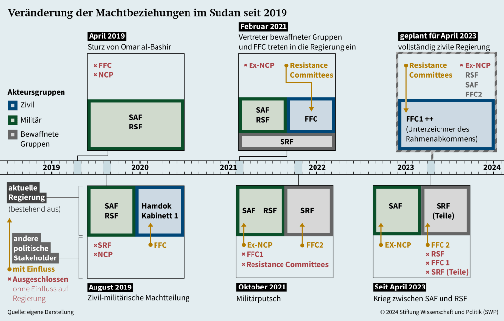 - Einerseits ermöglichte die Konkurrenz innerhalb des Sicherheitssektors, eine zivil-militärische Übergangsregierung zu bilden. Andererseits erhöhte der weitere Aufstieg der Rapid Support Forces zur Macht das Risiko eines bewaffneten Konflikts, erst recht nach dem Putsch 2021.