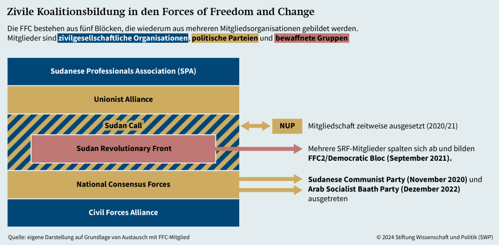 Die Einheit der zivilen Front im Rahmen der FFC bröckelte nach kurzer Zeit (siehe Grafik 2). Dies erschwerte es den zivilen Akteuren, das Militär für seine eigenmächtigen Erweiterungen der ihnen verfassungsrechtlich zustehenden Kompetenzen zur Verantwortung zu ziehen und demokratische Mechanismen zu institutionalisieren Die Gründe für diese Fragmentierung liegen nicht allein in den Spaltungsbestrebungen der Sicherheitskräfte oder einer bloßen Vielfalt von politischen Positionen, sondern zu einem Gutteil auch in den eng gefassten Machtinteressen der politischen Parteien. Diese waren stets um Sichtbarkeit und Einfluss bemüht und stark von der Nullsummenpolitik des ihnen bekannten autoritären Kontexts geprägt.